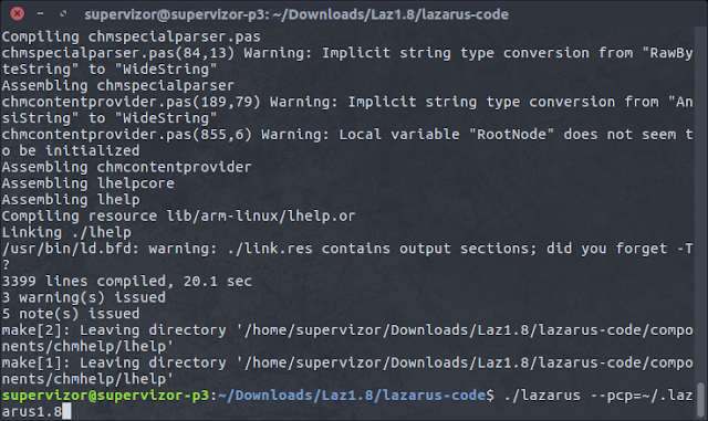 and as soon as the building is complete, lazarus is good to go! I use --pcp switch to define where I want this lazarus version to store its configuration in. I do this because I will have multiple versions of lazarus on this system, and default config path ~/.lazarus is already being used by another installation. This way you can have any number of Lazarus versions on a single system.