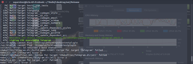 although, not with the Telegram, just with the fcitx and hime plugins. Will try to disable these plugins and just go with ibus. If I succeed that way, I will take a step back and try to at least make fcitx work. The only reference to a compiler command line with switches for linking fcitx and hime plugins are in the file ~/TBuild/tdesktop/out/Release/CMakeFiles/Telegram.dir/link.txt - I did not expect to find compilation command in a .txt file, but what do I know about makefile... I removed two switches: "-lfcitxplatforminputcontextplugin -lhimeplatforminputcontextplugin" entirely from the command line. Then went again to run make.