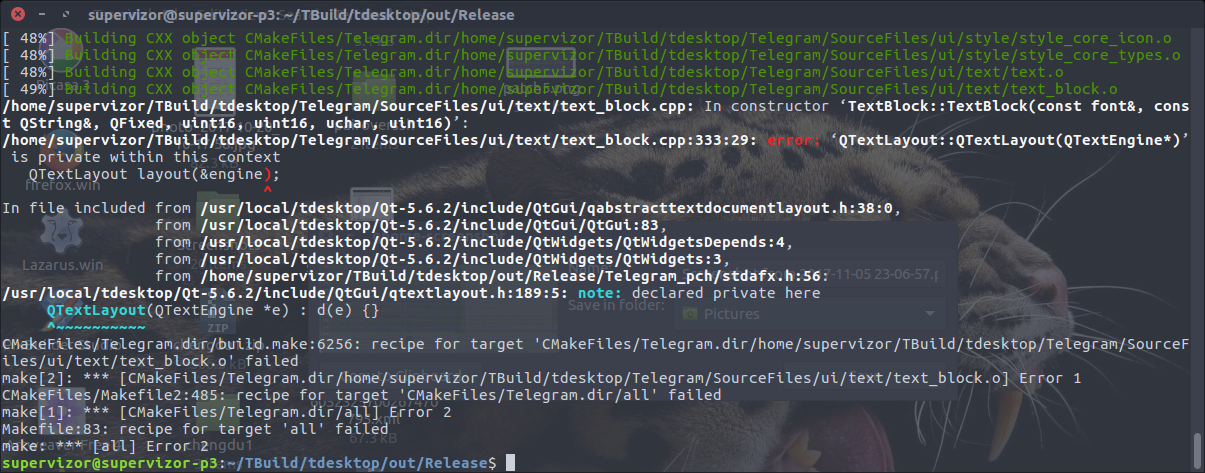 and so i was trying again, this time it was a lot of rebuilding of previously built parts, because of entirely new qt version:3:15 PM, Nov 7th 2017, the process failed at the previously reported error #6 (scroll up to find it), so I just applied the fix to the file /usr/local/tdesktop/Qt-5.6.2/include/QtGui/qtextlayout.h again and continued. That file got updated when I recompiled and reinstalled QT, so repeating this step was expected.