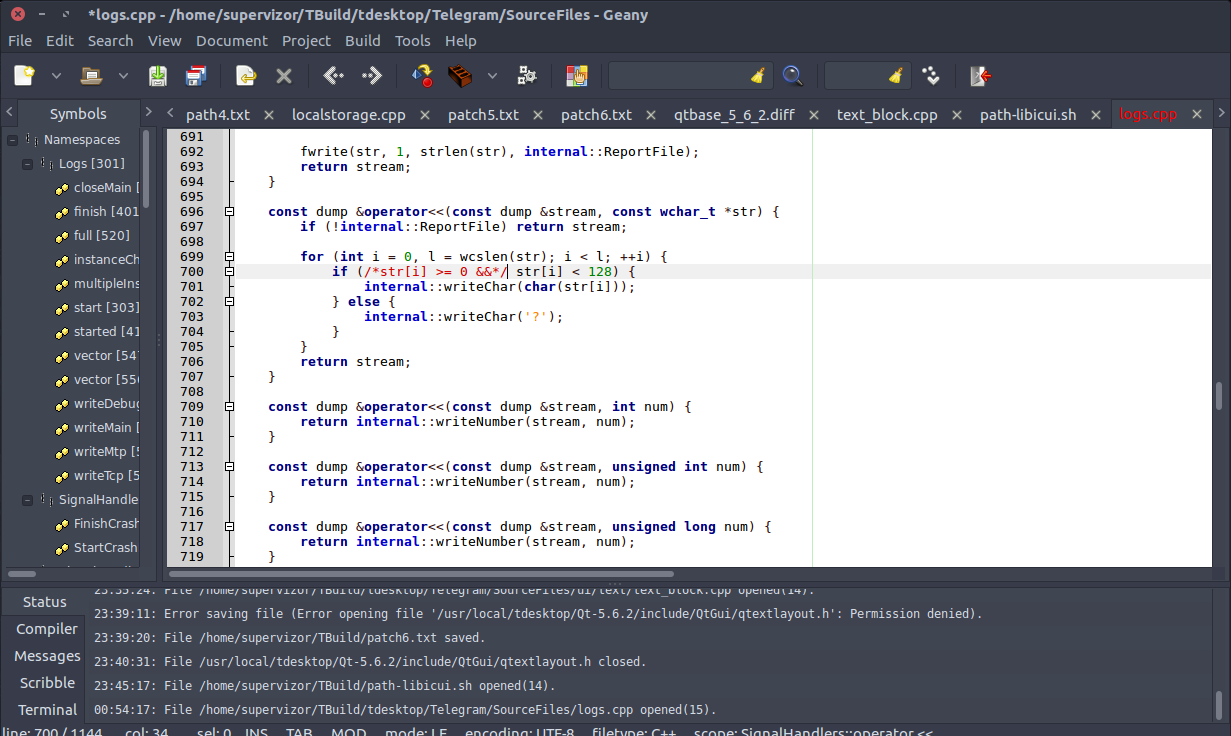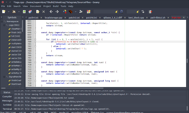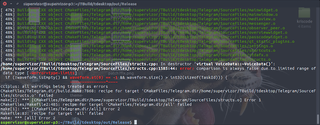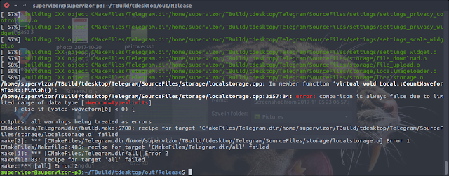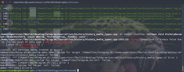After following the steps for installing prerequisites, the final step was to go into the TBuild/tdesktop/out/Release folder of where my sources were, and running the one final make. Only during that final building I have encounter few errors, and below they are listed in the chronological order. Included are fixes I made to enable the build process to continue. To be fair, the compiler is set for a mode of operation in which all warnings are treated as errors, so some of the errors described here are actually just warnings and would have not prevented the compilation otherwise. Especially was the case with few warnings about if statement conditions that always resolve to true, which were treated by the compiler as errors.